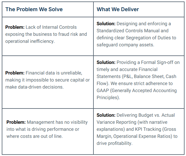Solution: Providing a Formal Sign-off on timely and accurate Financial Statements (P&L, Balance Sheet, Cash Flow). We ensure strict adherence to GAAP (Generally Accepted Accounting Principles).