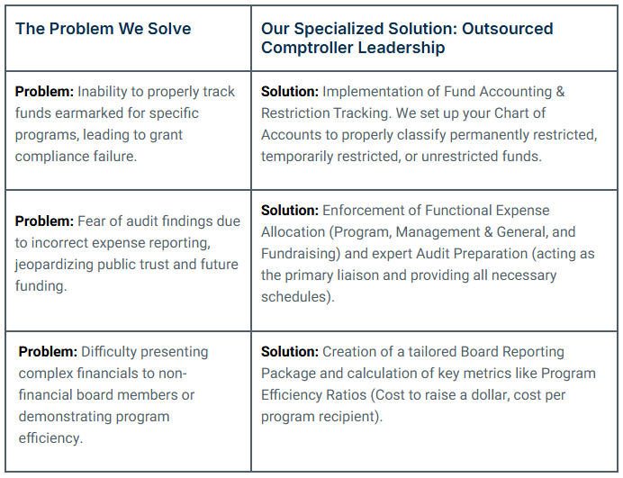 Nonprofits have a distinct challenge: their accounting must satisfy not only management but also boards, donors, and regulators. They require Comptroller expertise, focused strictly on compliance and ensuring the transparent stewardship of public and donated funds.